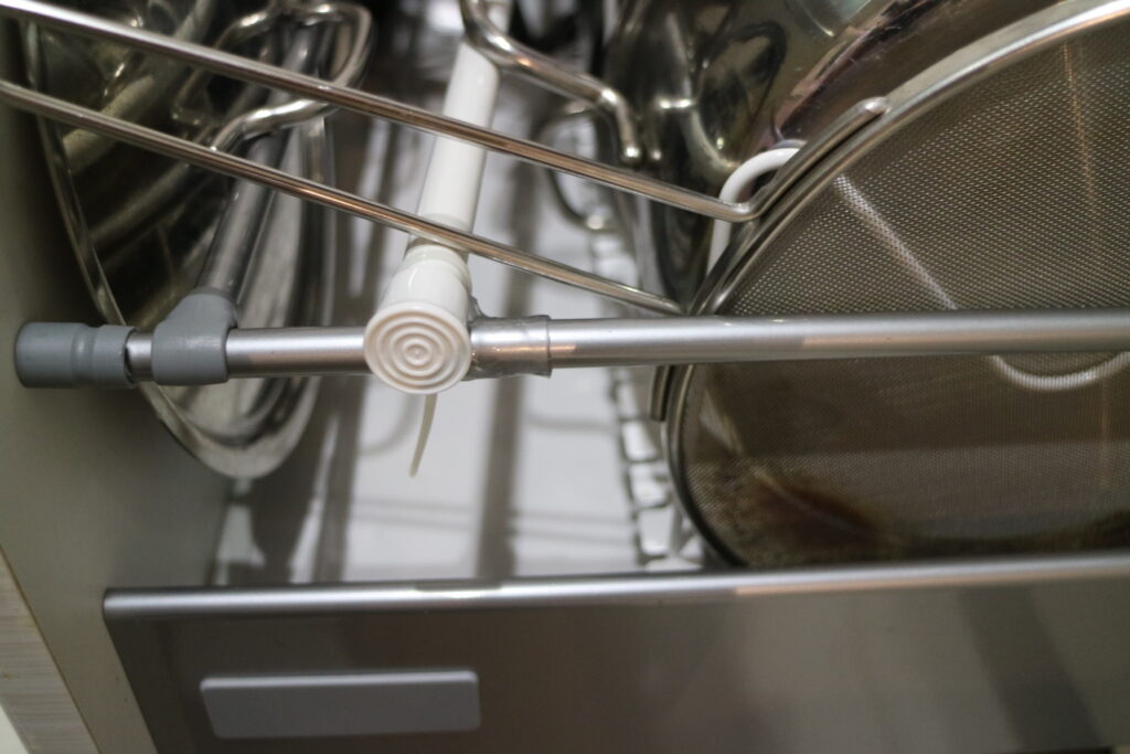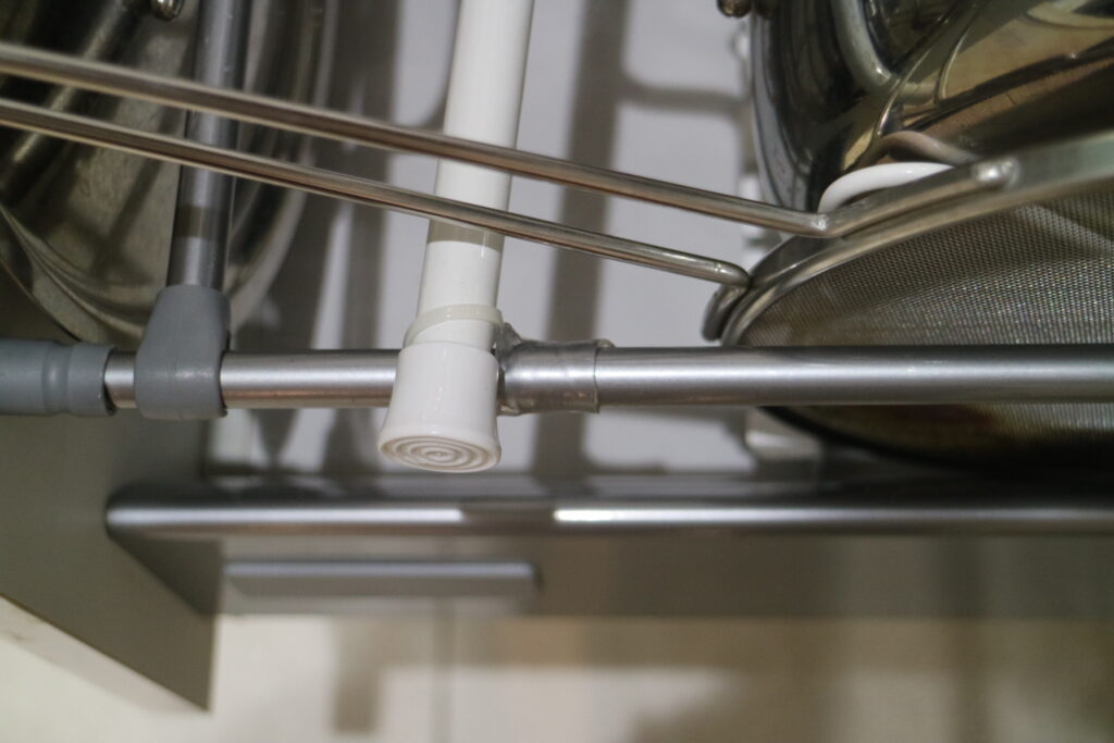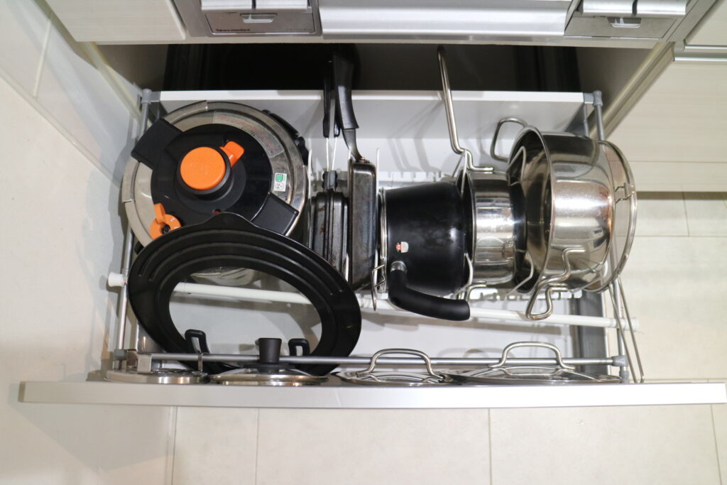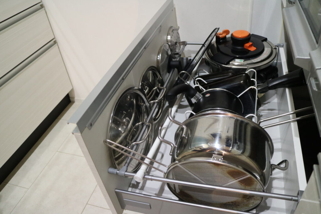 もともと立てて収納していた鍋蓋(小さめのもの)を、引き出しの扉側にバーで引っ掛けるスタイルに変更。